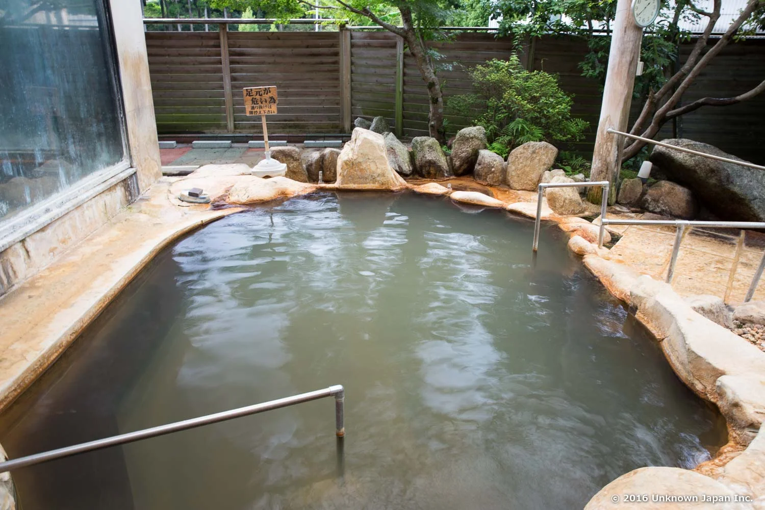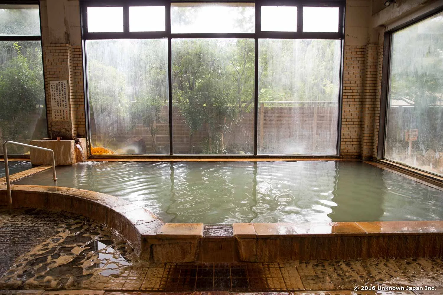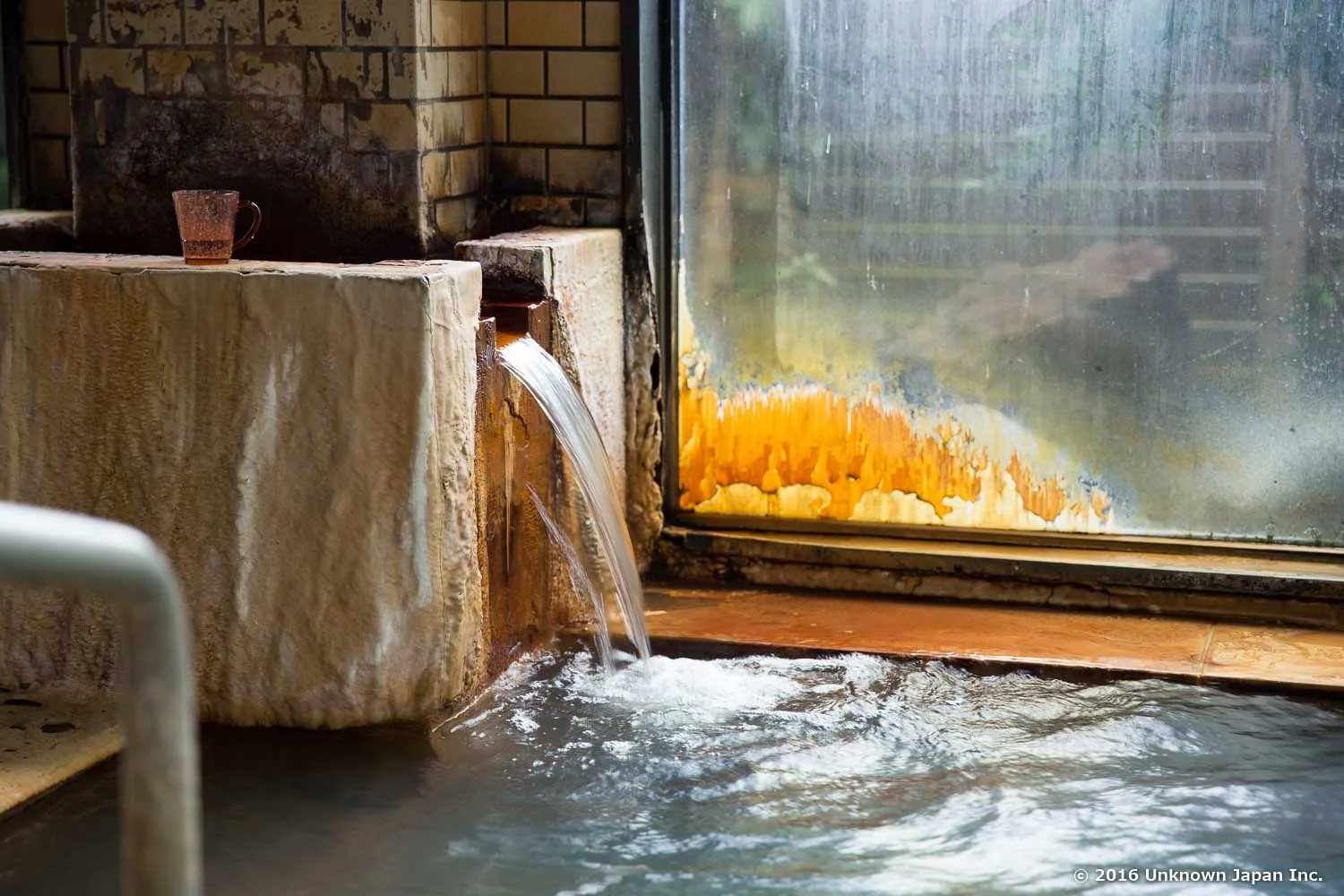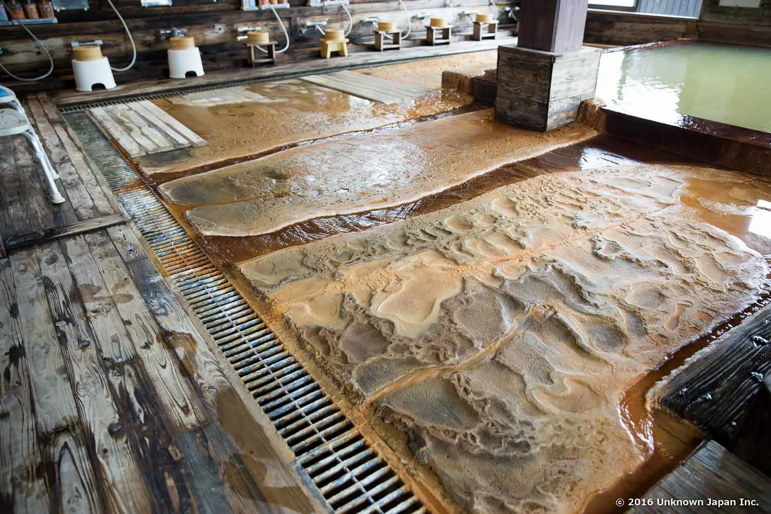 This is a picture of a bathroom which is exclusive to hotel guests. The bathroom floor is made by hinoki cypress; however, it is totally covered with deposited minerals, now you can hardly see the original material. This indicates how rich the minerals are. Some business travelers stay here instead of a business hotel close to the Kobayashi station only to take a bath here.