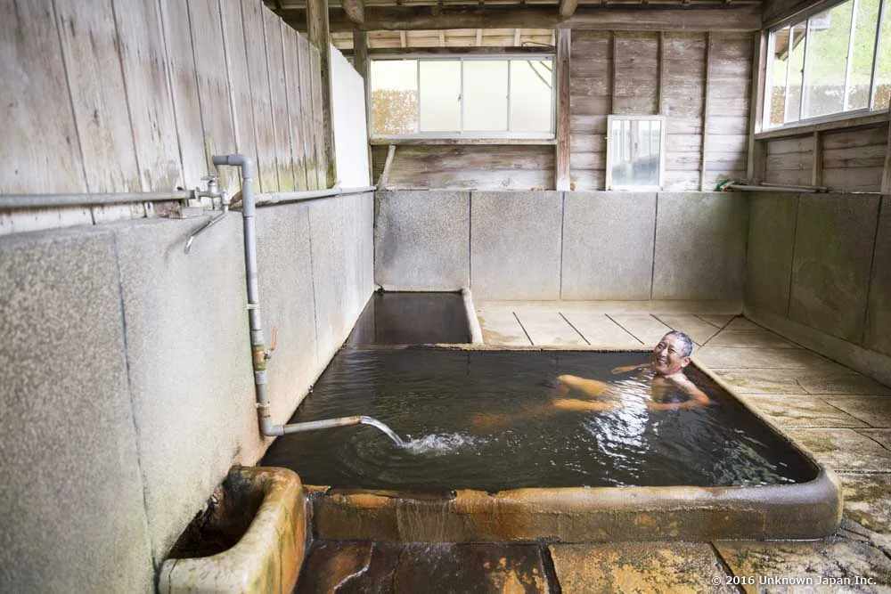 Tatsunori (the name of the man in the picture) frequently comes to Maeda Onsen since we moved to Yusui-cho after retiring his job. He says the water is good for cleaning greasy skin.