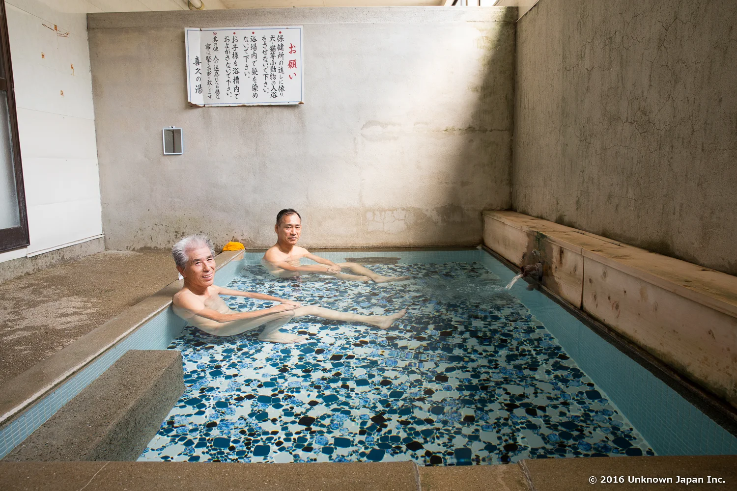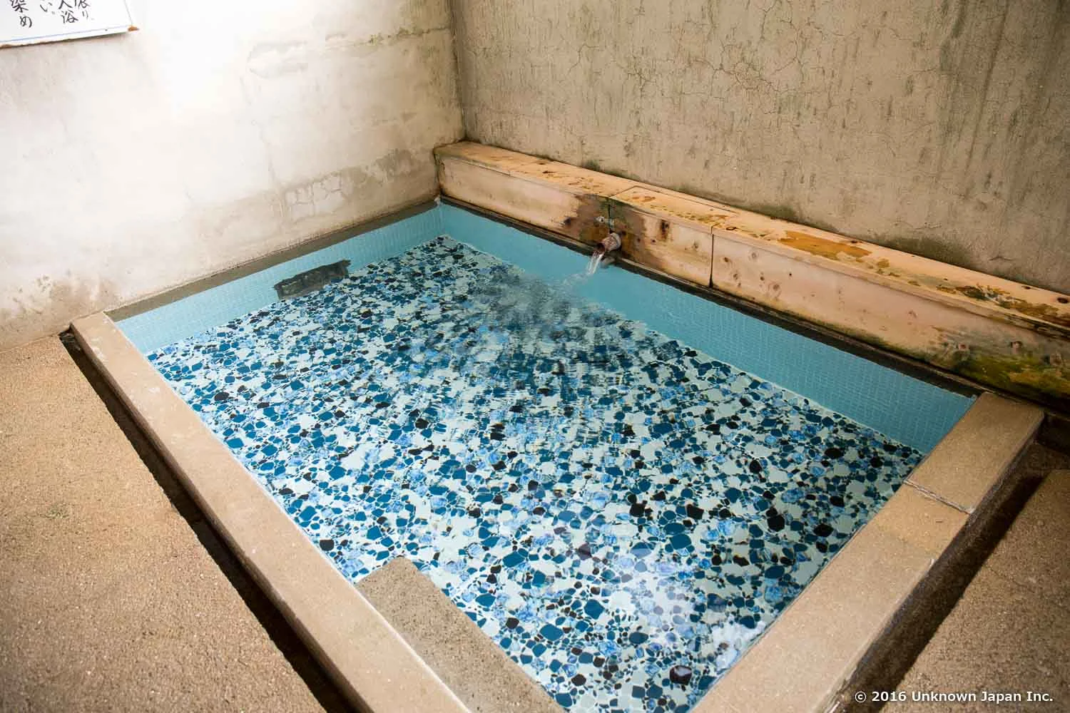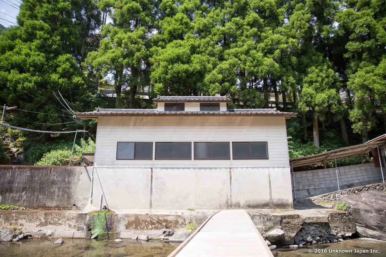 The building located at the end of the bridge is Kiku no yu. The appearance is very simple and implies it is a genuine local public bathhouse. The beginning of Kiku no yu is not certain, however it existed at least 60 years ago. It used to have a thatched roof and only have a mixed bath. Also, there were some tubs for other purposes such as soaking persimmons, washing clothes, and washing farm animals.