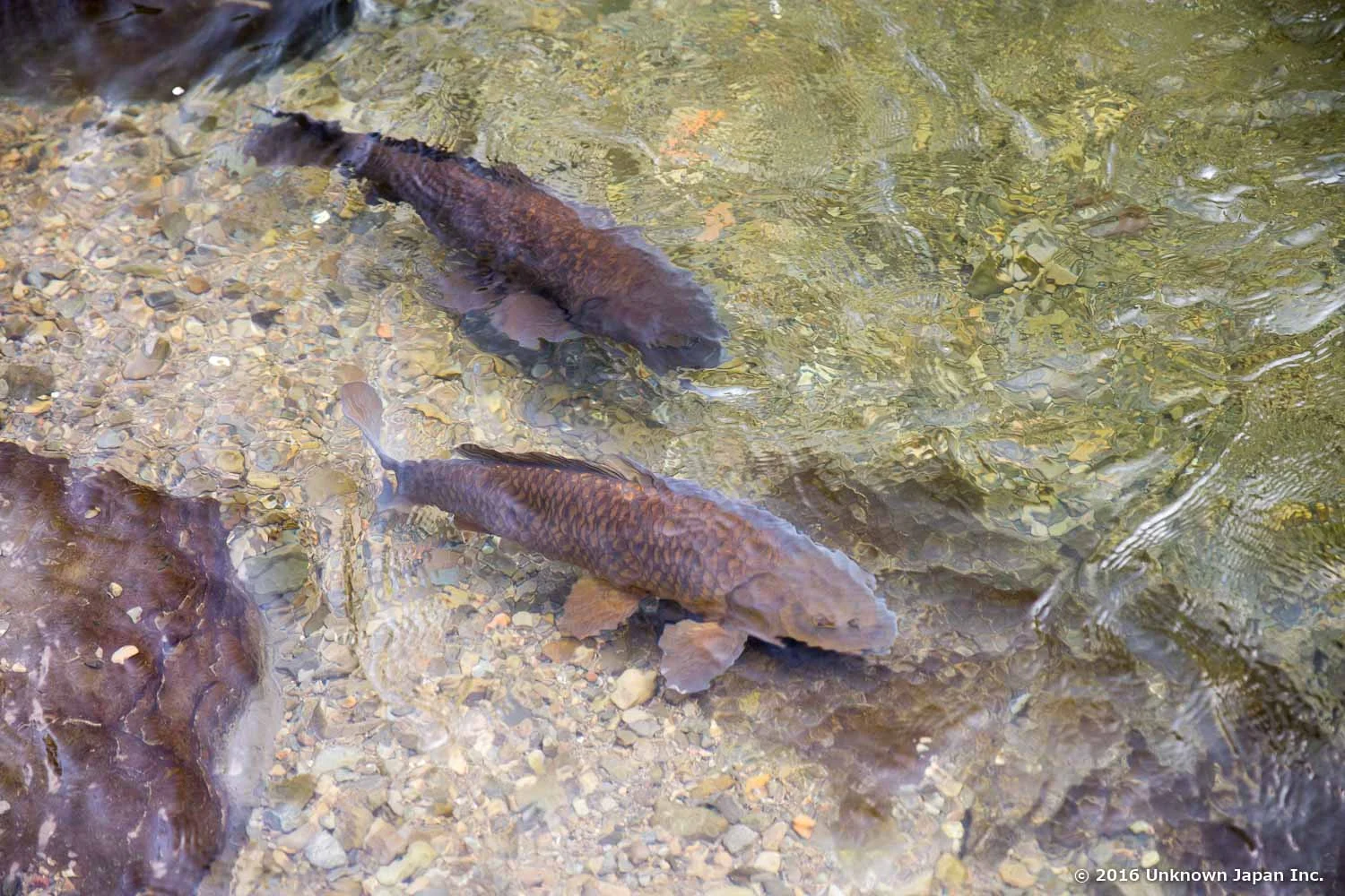 Finally, you can see a lot of big wild carps in the Yude river which is streaming right next to Kiku no yu. The water is amazingly clear. Also, small fishes are swimming at the gushing point of the hot spring. This onsen is loved by not only human beings!