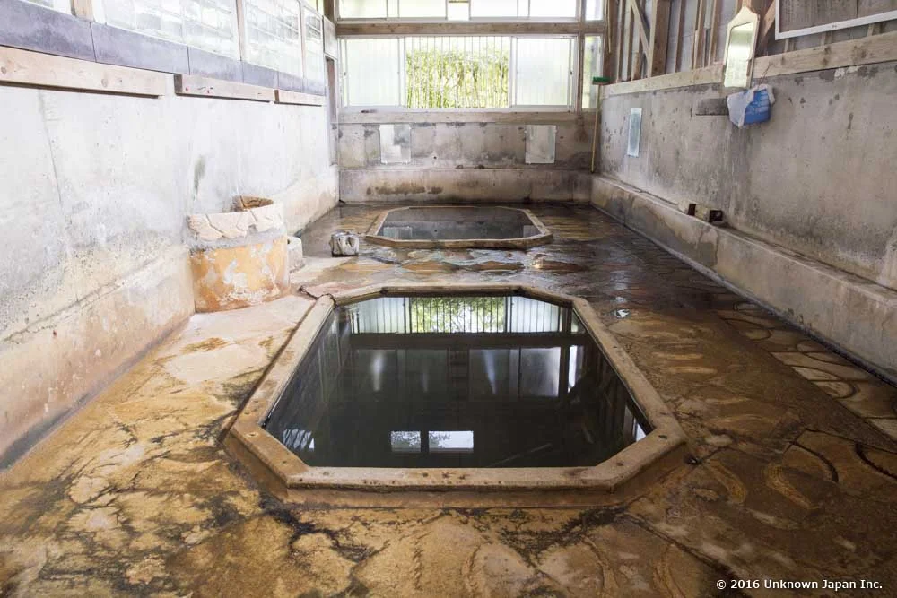 The sight of Masakari Onsen is like a waste land in a Sci-Fi movie. The bathroom is fully covered with the deposited minerals, and that made this curious sight. This is because the hot spring water contains a surprising amount of calcium and magnesium.