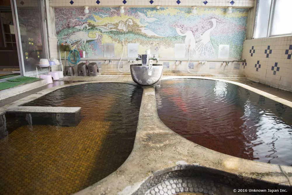 If you like moor hot spring containing plant-derived ingredients with a light scent of oily fragrance, I definitely recommend Tsurumaru Onsen. The shapes of bathtubs are unusual, and the colourful tile art on the wall is lovely. Also, you can enjoy bathing while listening to the jazz music in this onsen, which helps you to relax deeply.